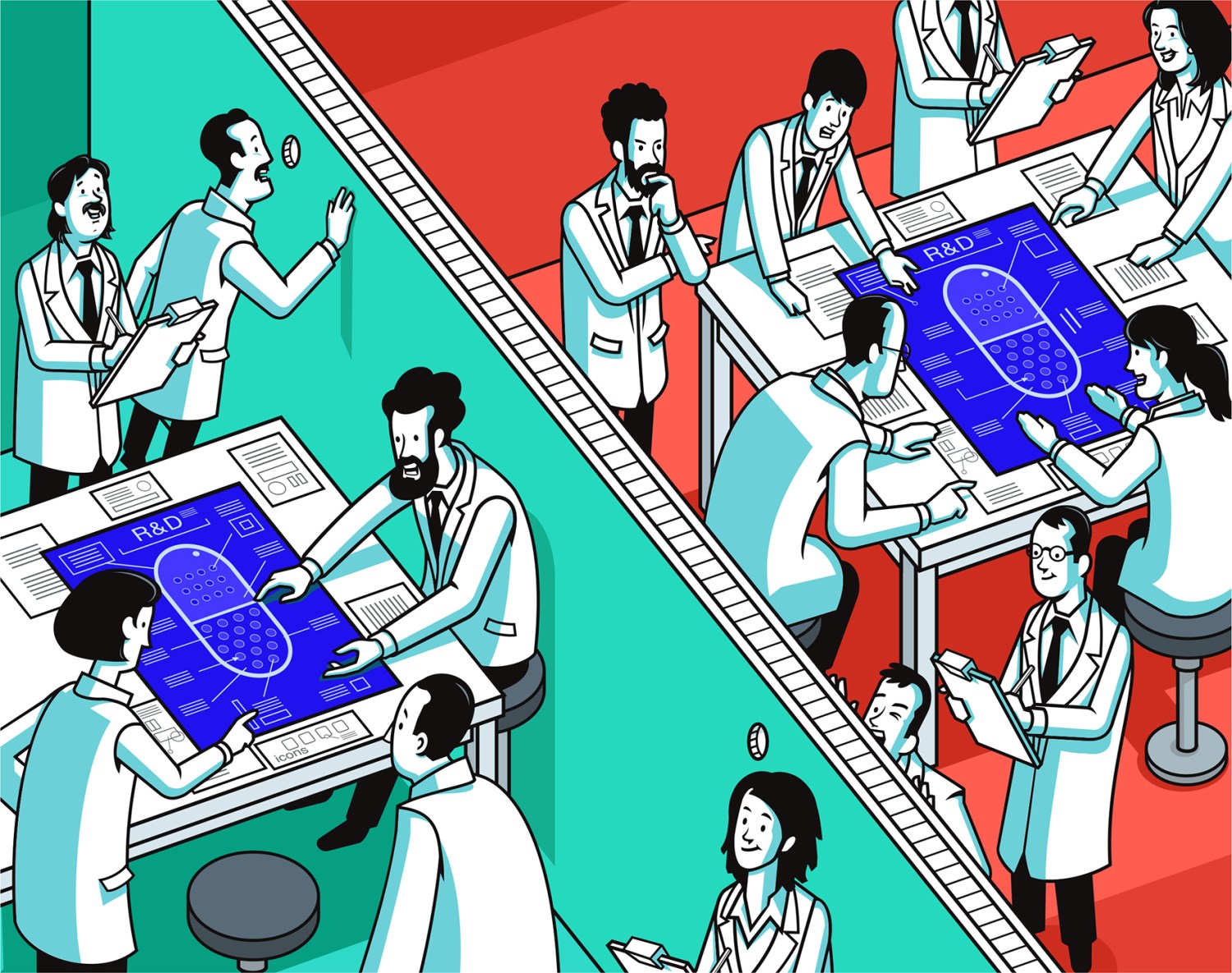 Large pharmaceuticals and keeping up with the competition. Drug / Medicine development similarities and coincidences. Medical editorial illustration concept.